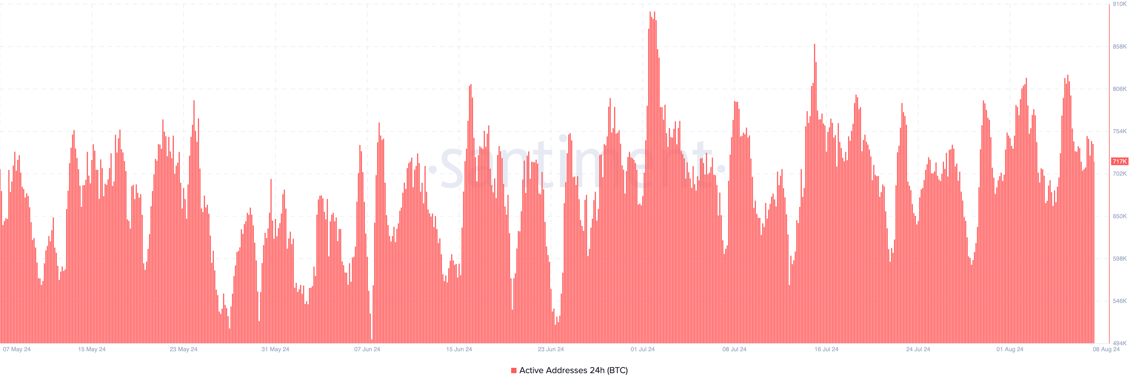 Ved flere lejligheder har BeInCrypto bemærket, at et godt niveau af privat interaktion med BTC begynder, når antallet af aktive adresser er over en million. Men ifølge Santiment har målingen haft svært ved at nå denne region siden marts.