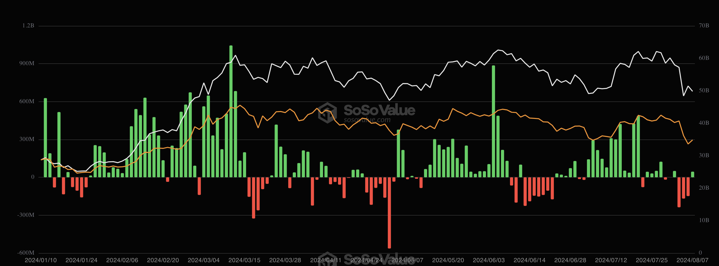 Faktisk var nettostrømmene fra ETF’erne negative under det pludselige kursfald den 5. august. Men nylige data viser, at det muligvis ikke længere er tilfældet. Det skyldes den samlede daglige nettostrøm på $45 millioner, der blev registreret den 7. august.