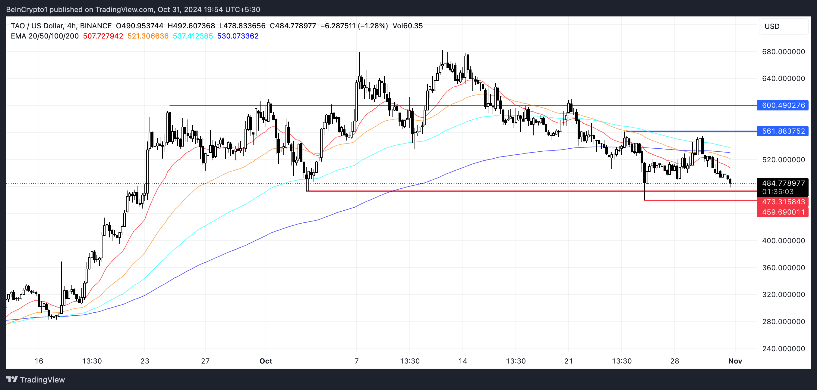 Hvis købspresset øges, kunne TAO målrette modstand ved $561. Hvis det niveau overskrides, kunne prisen stige til $600, hvilket repræsenterer en gevinst på 23,9%.