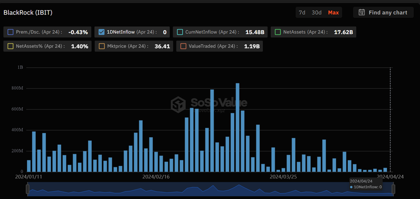 Den 24. april faldt den kumulative daglige tilstrømning til amerikanske Bitcoin-ETF’er, til et negativt beløb på 120,64 millioner dollars, ifølge data fra SoSo Value. Især IBIT, som tidligere har haft en kontinuerlig tilstrømning i 71 handelsdage, oplevede nul tilstrømninger på dagen.