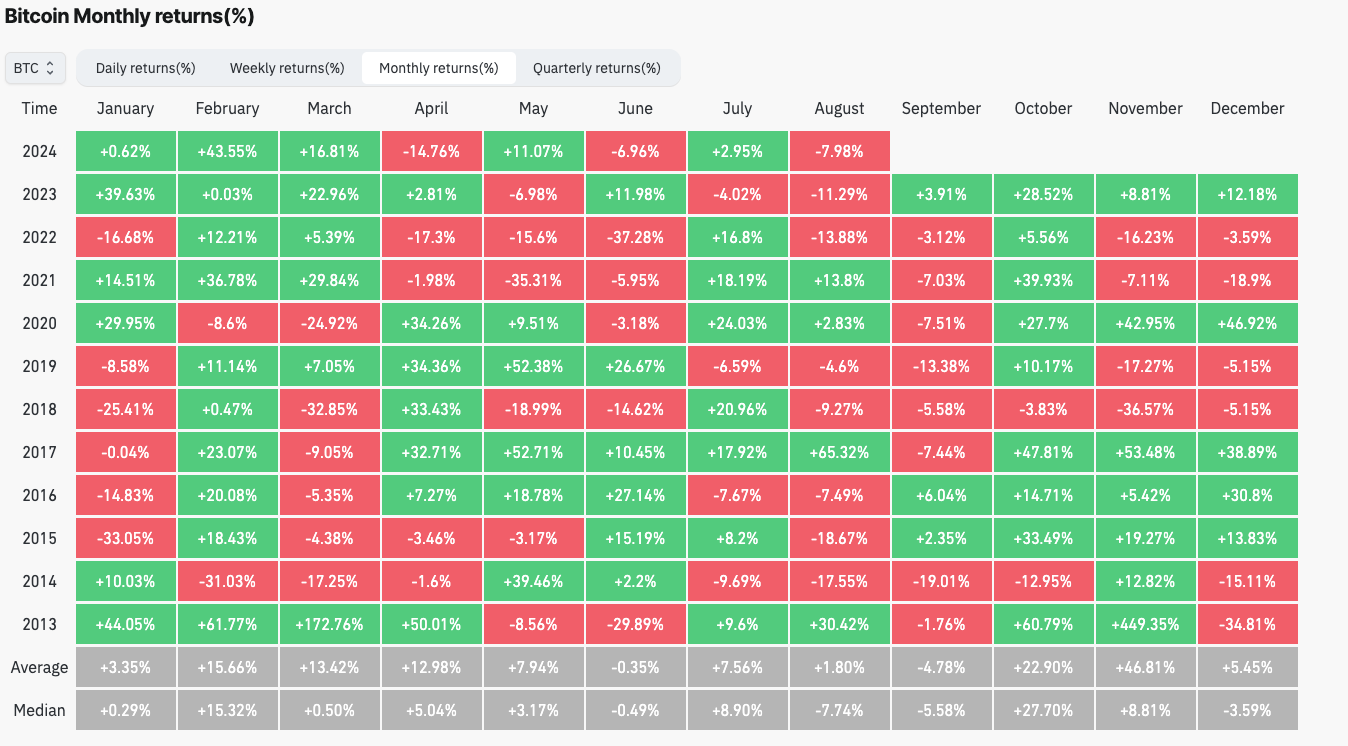 Desuden maler historiske præstationsdata et dystert billede for den kommende måned. Ifølge Coinglass har Bitcoin konsekvent underpræsteret i september, med et gennemsnitligt afkast på -4,78% siden 2013, hvilket gør det til kryptovalutaens værste måned.