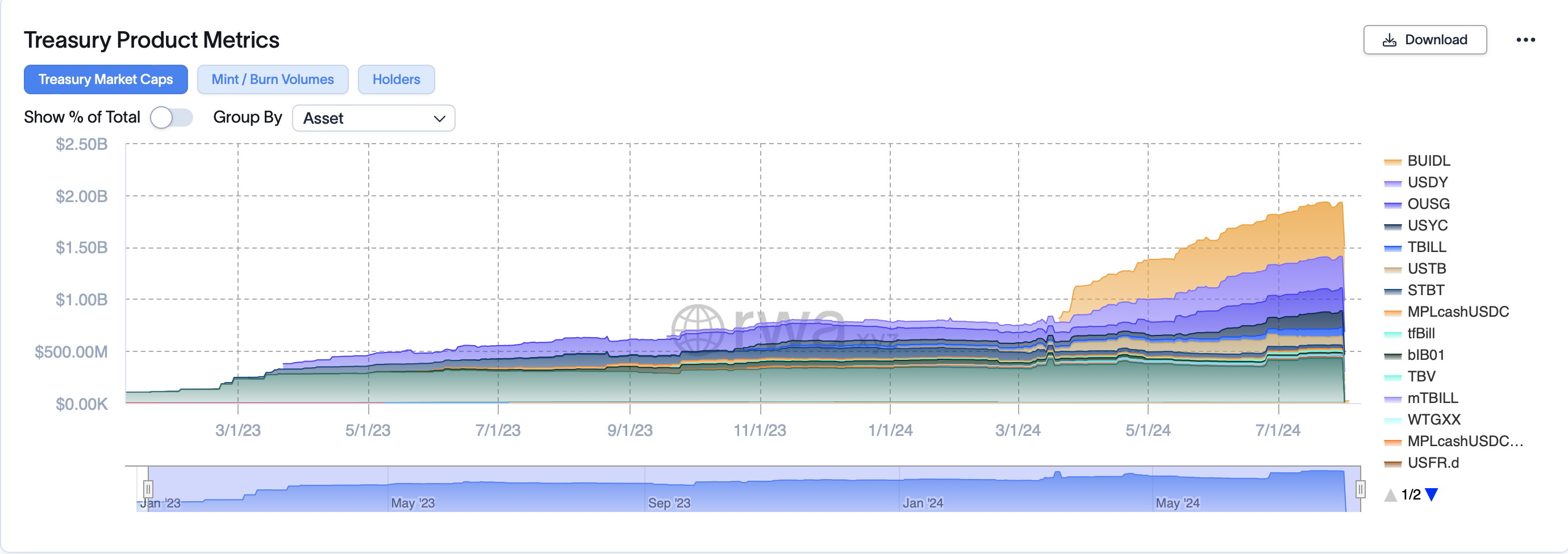 Det tokeniserede amerikanske statsobligationsmarked har oplevet betydelig vækst i 2024. Data fra RWA.xyz viser, at den samlede værdi af dette segment er vokset fra $726,23 millioner til $1,88 milliarder i år. BlackRocks BUIDL og Franklin Templetons FOBXX er store bidragydere, med markedskapitaliseringer på henholdsvis $522,81 millioner og $414,30 millioner.