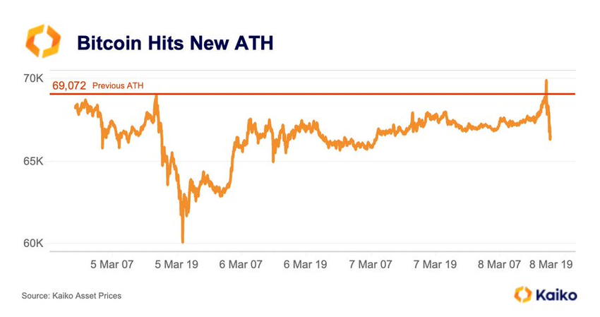 Ikke desto mindre blev begejstringen hurtigt vendt til bekymring, da markedet oplevede et kraftigt udsalg, der mindede om kryptos berygtede volatilitet. Ifølge blockchain-analysefirmaet Kaiko steg Bitcoins pris til 69.952 dollars og faldt med næsten 6% til 66.120 dollars kort tid efter, hvilket afviklede millioner i lange og korte positioner på tværs af flere kryptobørser.