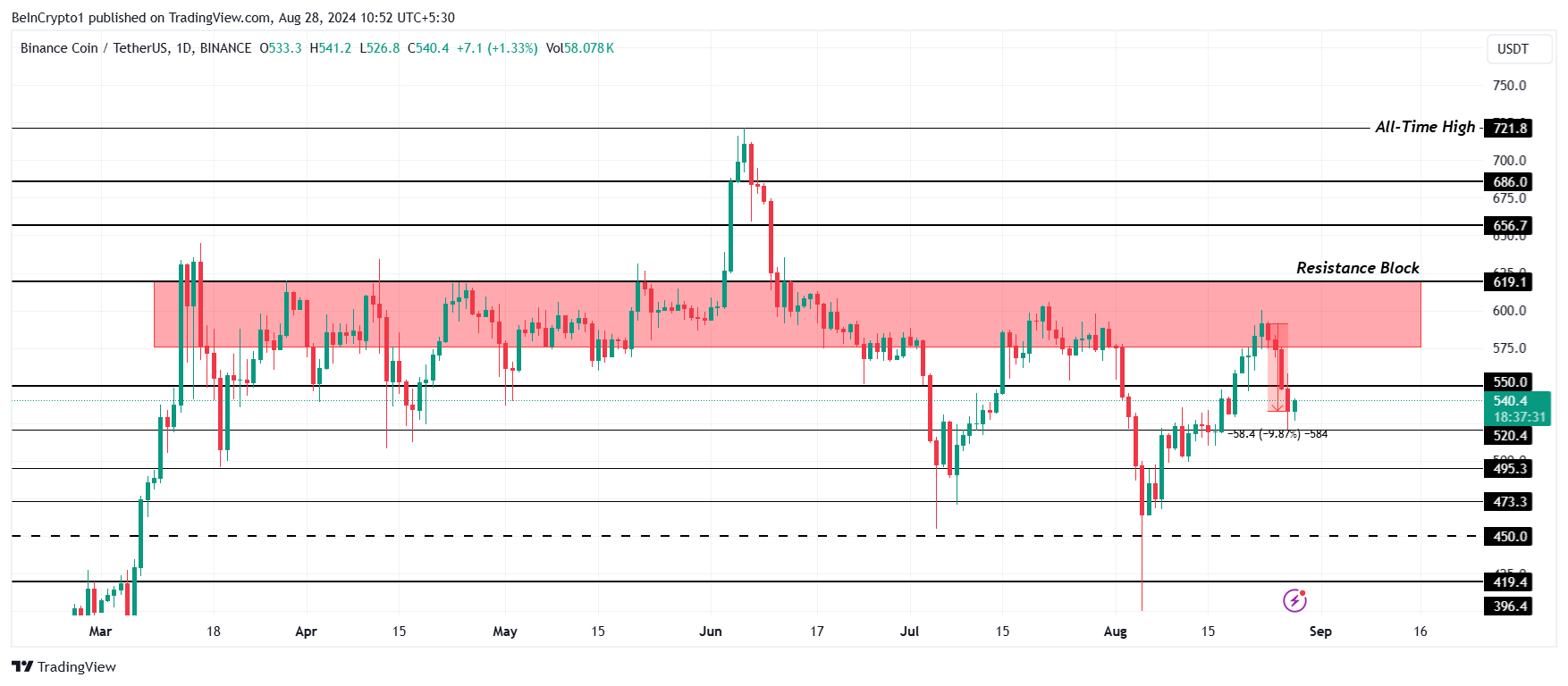BNB’s kurs, der handles til $540 i øjeblikket, er faldet med 9,8% over de sidste fire dage. Dette fald kom efter at Binances native token indtrådte i den fem måneder gamle modstandszone fra $575 til $619.