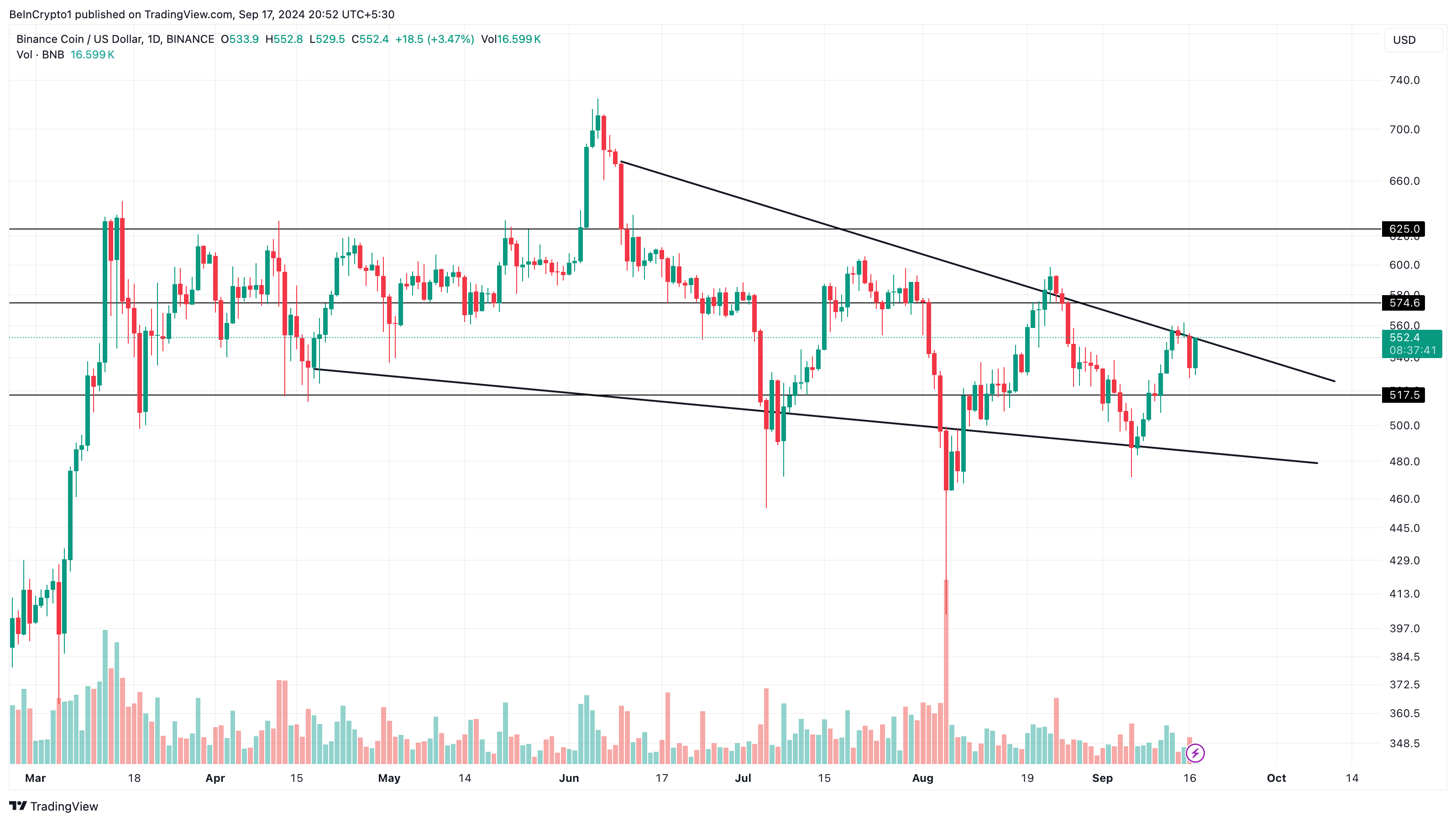 Trods nylig volatilitet ser det ud til, at Binance Coin (BNB) viser modstandsdygtighed, idet dens kurs har holdt sig over $500 siden den 11. september og i øjeblikket handles til $552.