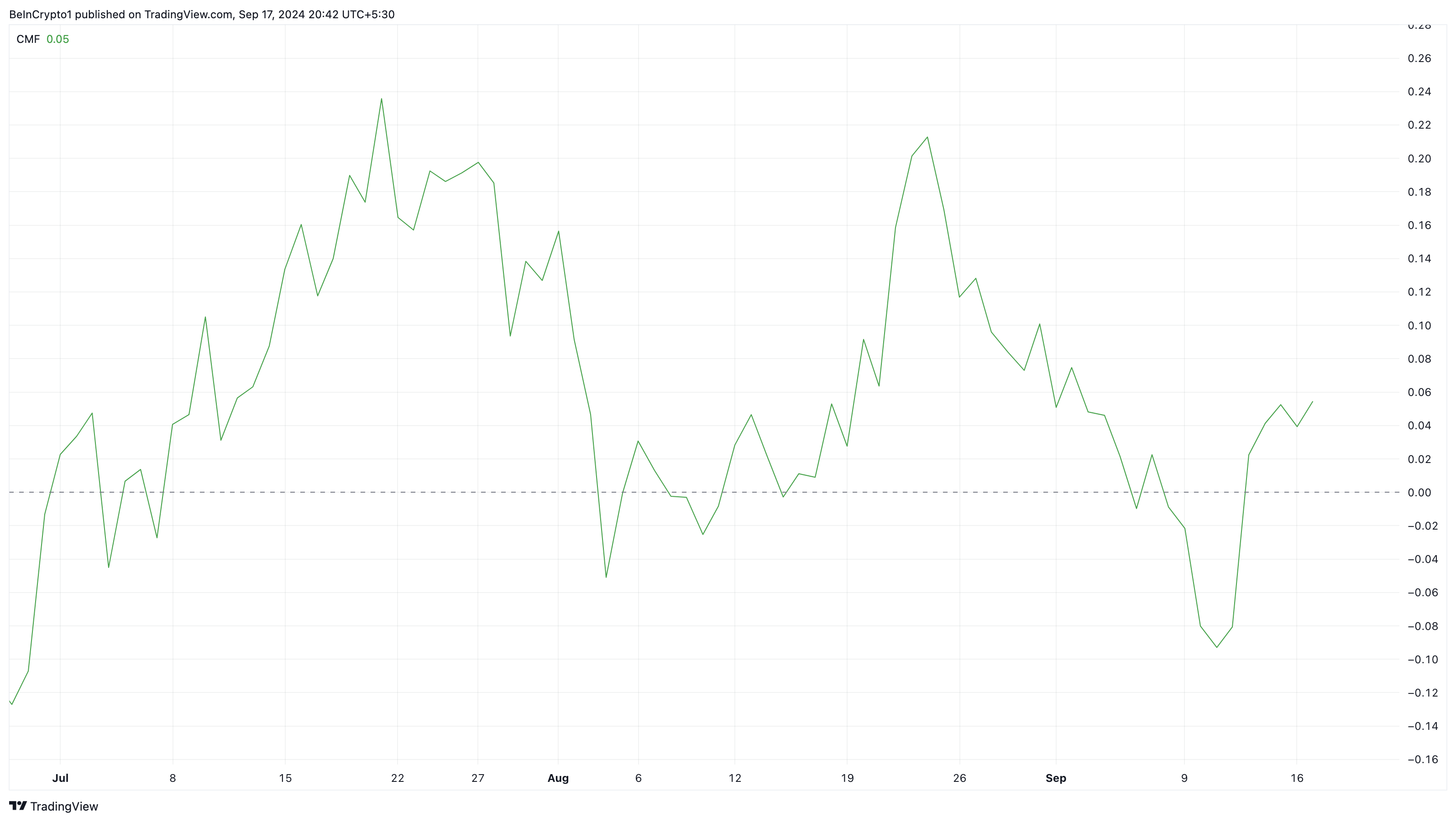 Ud over MACD understøtter Chaikin Money Flow (CMF) indikatoren også et bullish udsyn. CMF måler akkumulerings- eller distributionsraten over en given tidsramme. Når CMF stiger over nul-linjen, antyder det, at akkumulering — købstryk — er stærkere end distribution, hvilket signalerer bullish momentum.