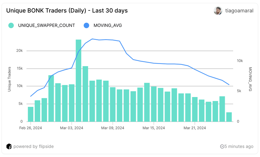 Den 4. marts nåede BONK et rekordhøjt niveau med 187.000 daglige handler. Men dette højdepunkt var flygtigt. Kort tid efter faldt den til et 30-dages lavpunkt på 22.200 handler den 23. marts. Det 7-dages glidende gennemsnit for BONK-handler er stadig faldende. De sidste tre dage har dog vist lovende tegn. Handelsaktiviteten er begyndt at komme sig og er steget fra 22.200 den 23. marts til 34.800 den 25. marts.