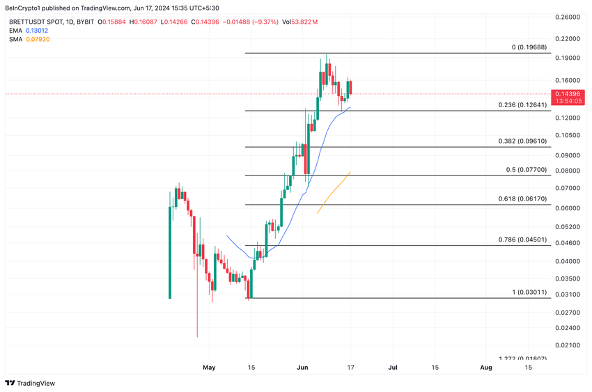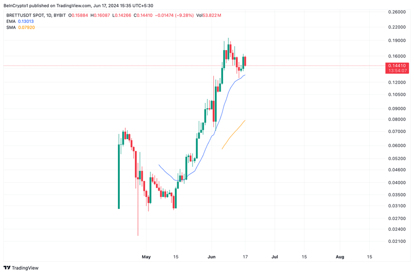 Til sin nuværende pris på $0,15 handler BRETT over sine vigtigste glidende gennemsnit. Tokenets pris ligger over dets 20-dages eksponentielle glidende gennemsnit (EMA) og 50-dages lille glidende gennemsnit (SMA).