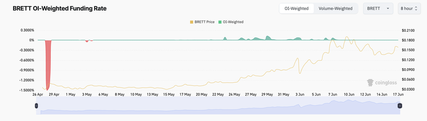 En positiv finansieringsrente har ledsaget BRETT’s stigende futures open interest. On-chain data viser, at BRETTs finansieringssats sidst var negativ den 4. maj. Det har siden kun returneret positive værdier. I skrivende stund er BRETTs finansieringssats 0,01%.