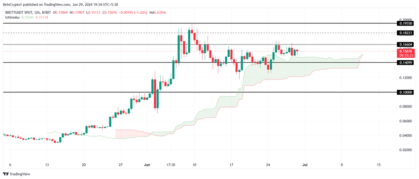 Ichimoku-skyen under lysestagerne er et bullish tegn, der antyder, at optrenden kan fortsætte. Kombineret med de førnævnte faktorer har Bretts pris potentialet til at etablere en ny ATH over $ 0,20.