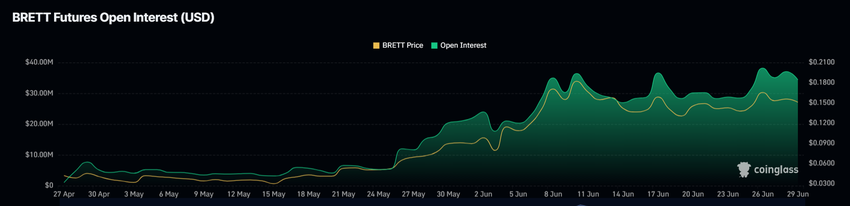 Bretts pris, der kræver $0,15 som støtte , er en positiv udvikling. På trods af den nylige tilbagetrækning har meme-møntens Open Interest vist bemærkelsesværdig modstandsdygtighed. OI fortsætter med at vokse og står i øjeblikket på $ 34.8 millioner. Dette tyder på, at investorerne stadig har betydelig optimisme, selv i lyset af udfordrende markedsforhold.