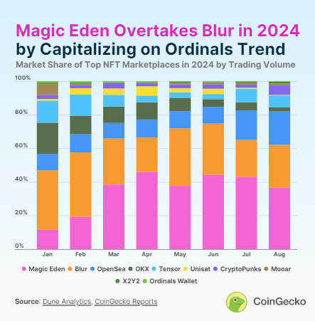 Trods modstand forbliver Magic Eden en dominerende kraft på NFT-markedet, ligesom OpenSea. Ifølge en nylig rapport fra CoinGecko har Magic Eden 36,7% af markedsandelen. Alene i august registrerede platformen en månedlig handelsvolumen på $122,47 millioner.