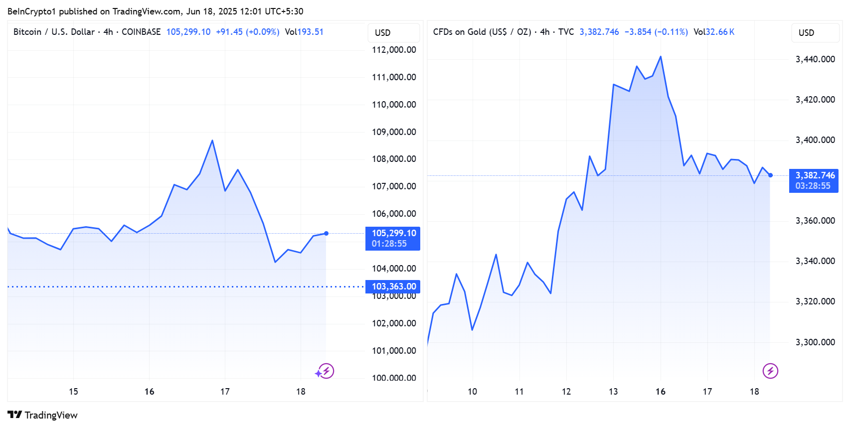 Bitcoin (BTC) steg til $105.000 på onsdag efter kortvarigt at være faldet til $103.000. Opsvinget kommer under stigende spændinger i Mellemøsten, som gradvist skubber de globale markeder i en risikoavers tilstand.