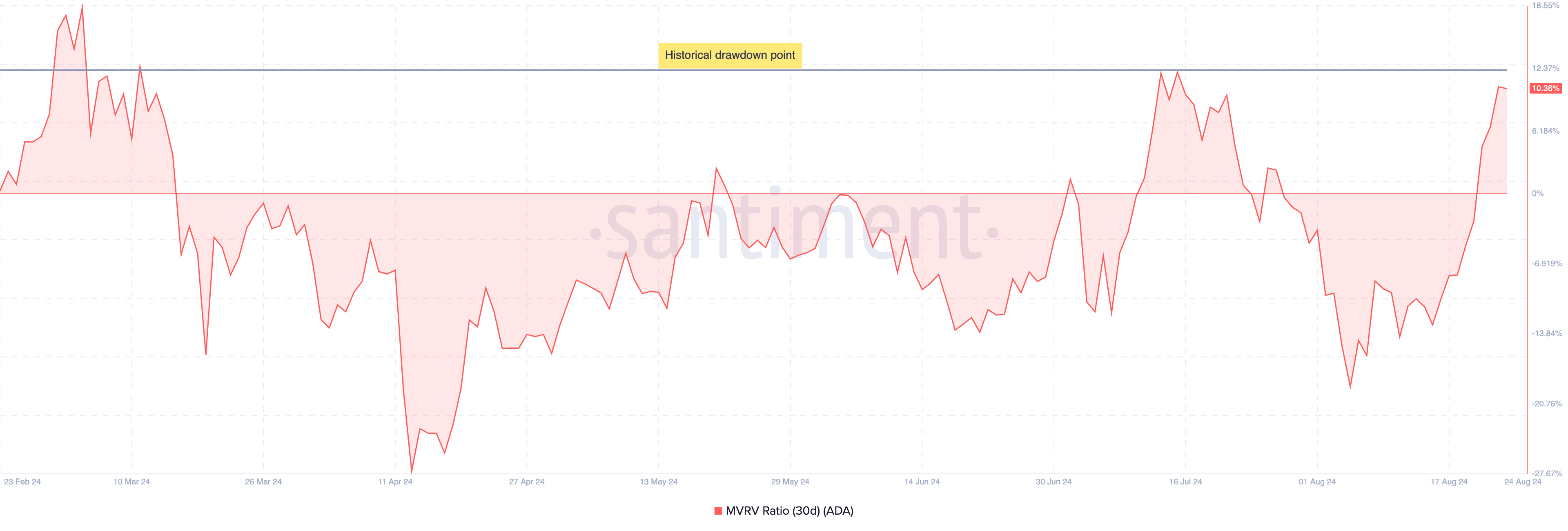 Den nylige kursstigning har også påvirket Cardanos Market Value to Realized Value (MVRV) forhold, en måling, der giver indsigt i indehavernes rentabilitet, købsadfærd og potentialet for markedstoppe eller -bunde. Den 20. august stod ADAs 30-dages MVRV-forhold på 0,32%, hvilket signalerede, at den gennemsnitlige indehaver havde tab.