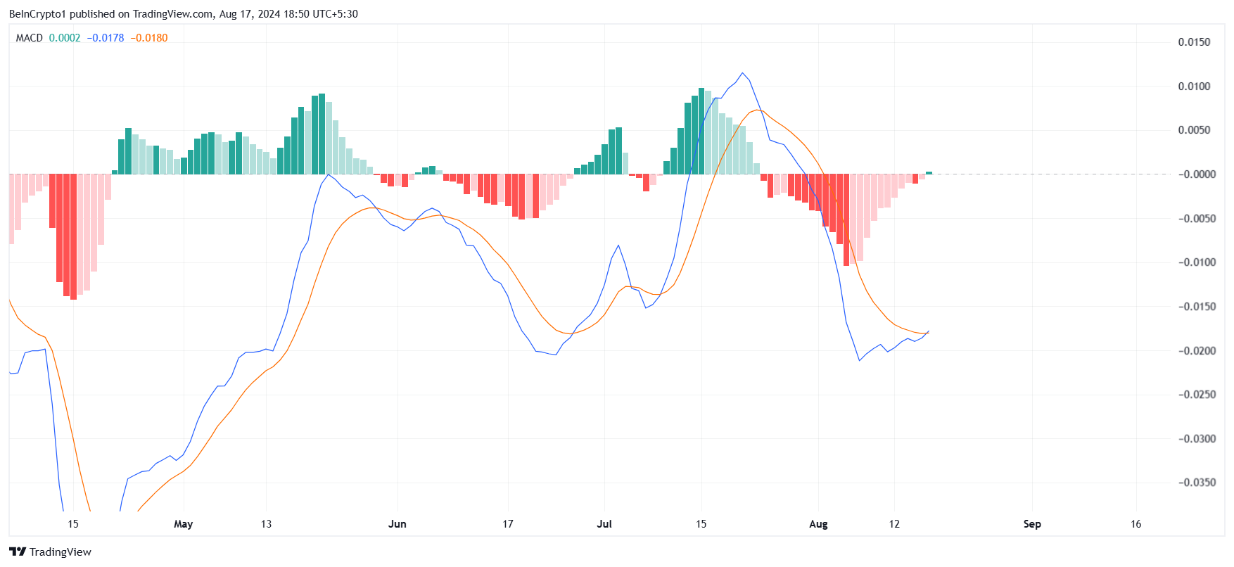 Tegn på, at Cardanos kurs potentielt kunne ændre retning, bliver mere tydelige. Moving Average Convergence Divergence (MACD) indikerer i øjeblikket en bullish krydsning, hvilket antyder en mulig trendændring for altcoinen. Denne krydsning kan også være et tidligt signal om opadgående momentum, som kan tiltrække mere interesse fra handlende og investorer.