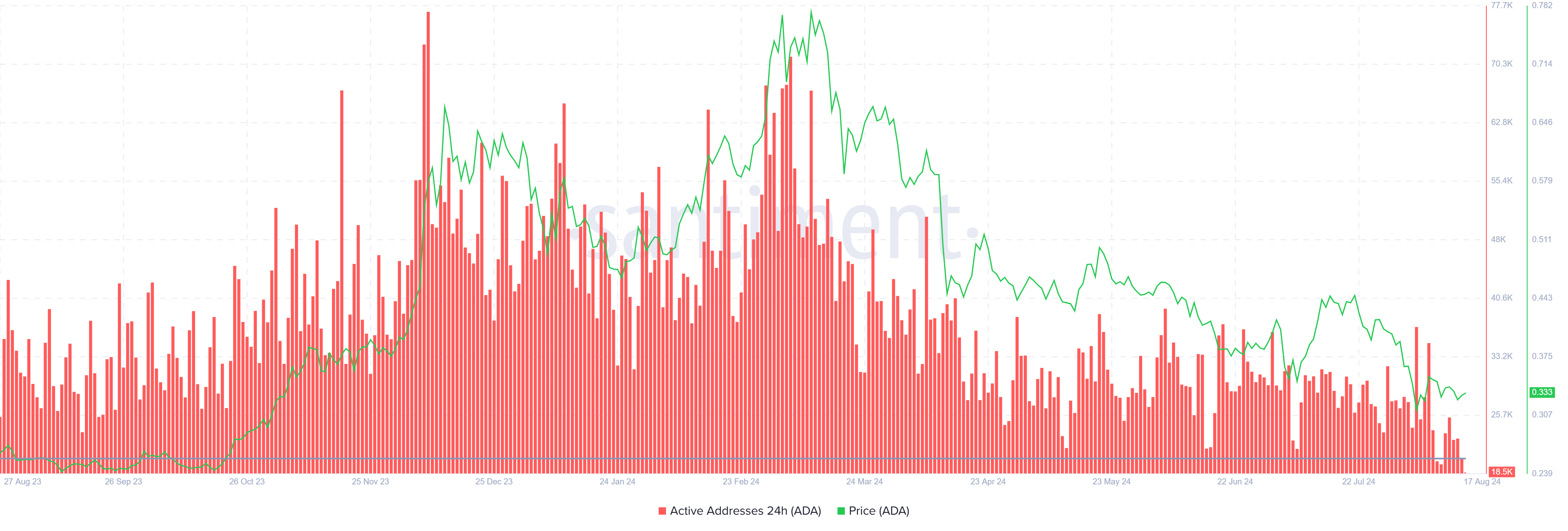 Men på trods af det lovende MACD-signal er deltagelsen blandt ADA-investorerne på et flerårigt lavpunkt. Den mangel på aktivitet er bekymrende, da den indikerer en generel mangel på interesse eller forsigtighed blandt investorer, hvilket kan begrænse effekten af den bullish krydsning.