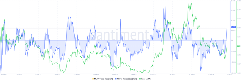 I øjeblikket står Cardanos 30-dages MVRV på 11%, hvilket indikerer, at mange investorer er i en profitabel position. Den rentabilitet fører ofte til salgspres, da investorerne søger at sikre gevinster, hvilket kan forårsage en prisrettelse.