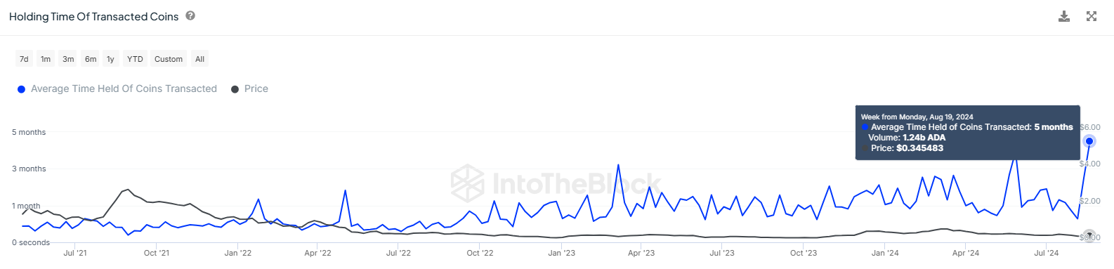 Den gennemsnitlige beholdningstid for de omsatte ADA-coins er allerede steget til fem måneder. Denne længere beholdningsperiode antyder, at selv mellemlange holdere nu sælger. Når ældre coins bevæger sig, påvirker de prisudviklingen.
