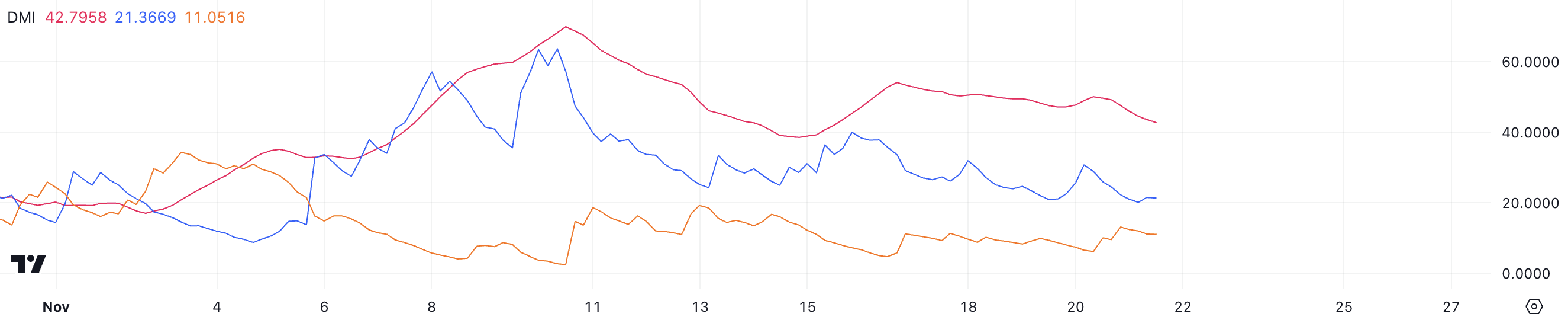 Cardano DMI-diagram viser en ADX på 42,7, hvilket indikerer en stærk trend. Målingen har været over 40 siden 7. november. Denne høje ADX-værdi bekræfter robustheden af ADAs igangværende opsving, hvilket signalerer solid momentum bag de seneste kursbevægelser.