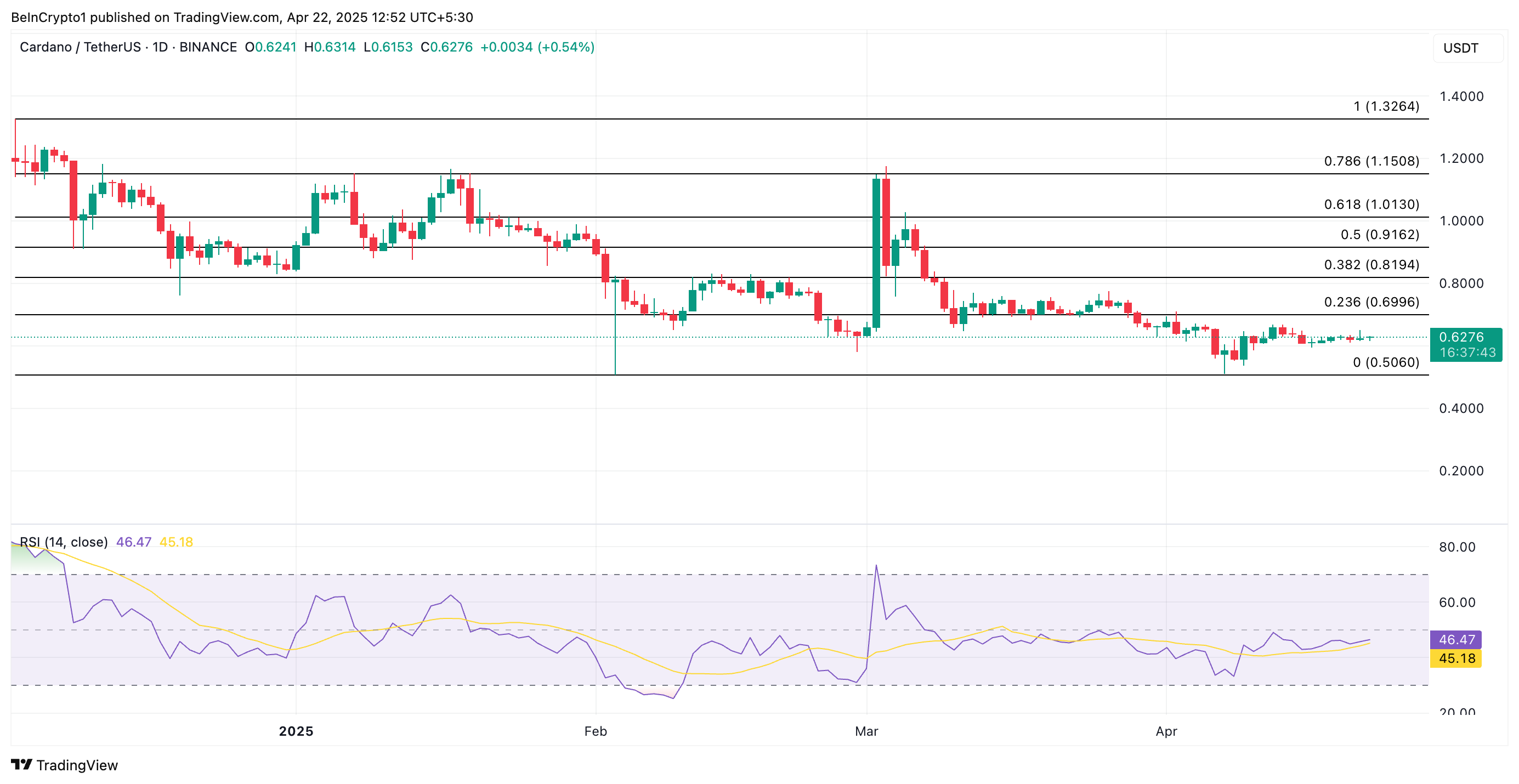 På det daglige diagram understøtter aflæsninger fra ADAs Relative Strength Index (RSI) denne bearish udsigt. I øjeblikket er denne vigtige momentumindikator, der sporer et aktivs oversolgte og overkøbte markedsforhold, på 46,47.