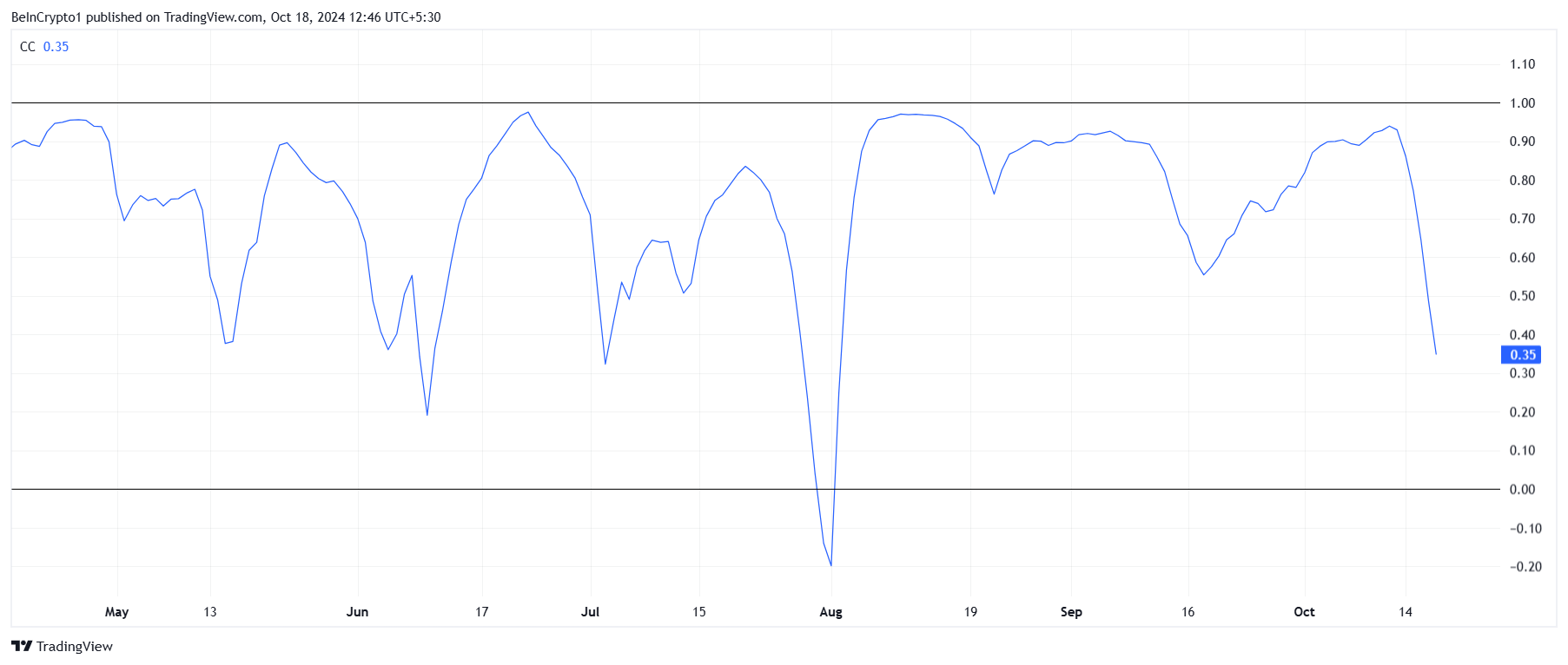Cardanos korrelation til Bitcoin er faldet markant, en udvikling, der har fanget markedets opmærksomhed. I øjeblikket er korrelationen på 0,35, hvilket er det laveste niveau i mere end to og en halv måned.