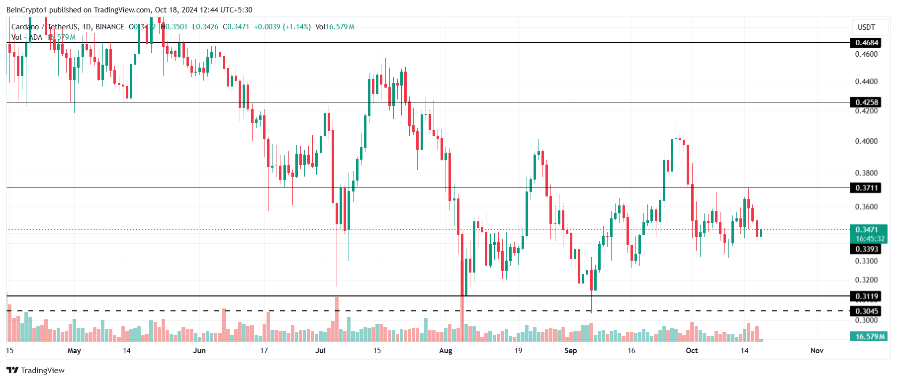 Cardanos pris har svinget mellem $0,37 og $0,33 siden begyndelsen af oktober. Denne konsolidering forventes at fortsætte, da markedskræfterne forbliver afbalancerede. Investorer bør forvente, at ADA forbliver inden for dette interval i den nærmeste fremtid, medmindre en større begivenhed ændrer markedsdynamikken.