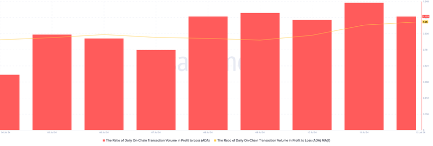 Cardanos (ADA) tocifrede opsving i den seneste uge har resulteret i profit for mange af dens indehavere. BeinCrypto vurderede forholdet mellem ADA’s daglige on-chain transaktionsvolumen i profit kontra tab ved hjælp af et syv-dages glidende gennemsnit, og det gav en værdi på 1,05.