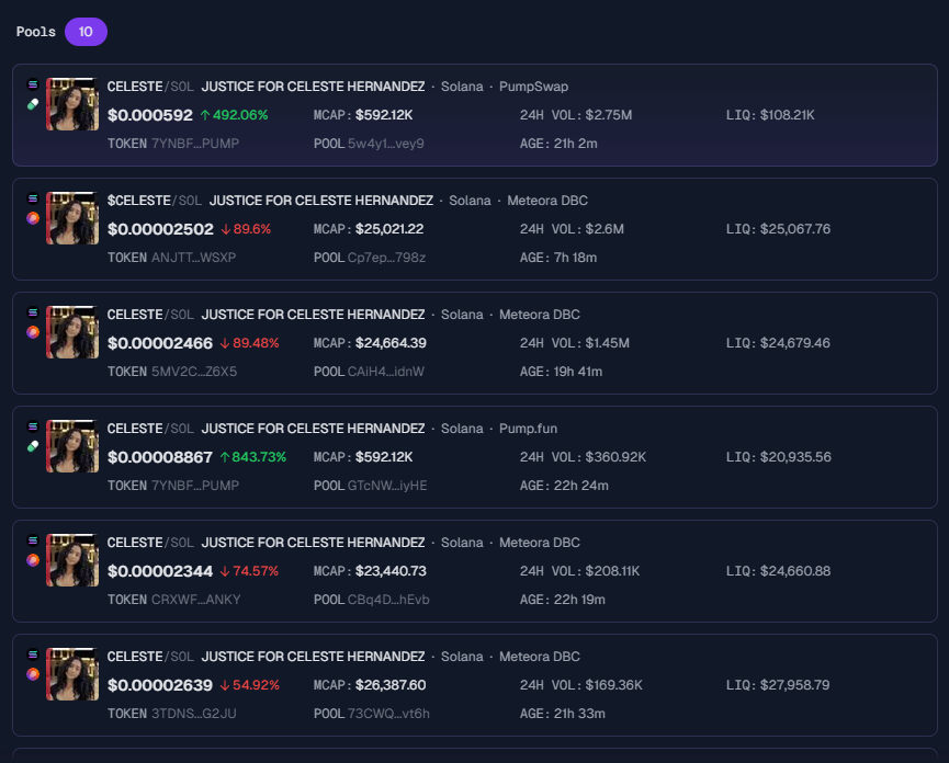 Vrede på sociale medier blomstrer efter 15-årige Celeste Rivas Hernandez’ død, og meme coins lanceres i kølvandet. Nogle af disse “Justice for Celeste” tokens nåede en markedsværdi på 1 million dollars.