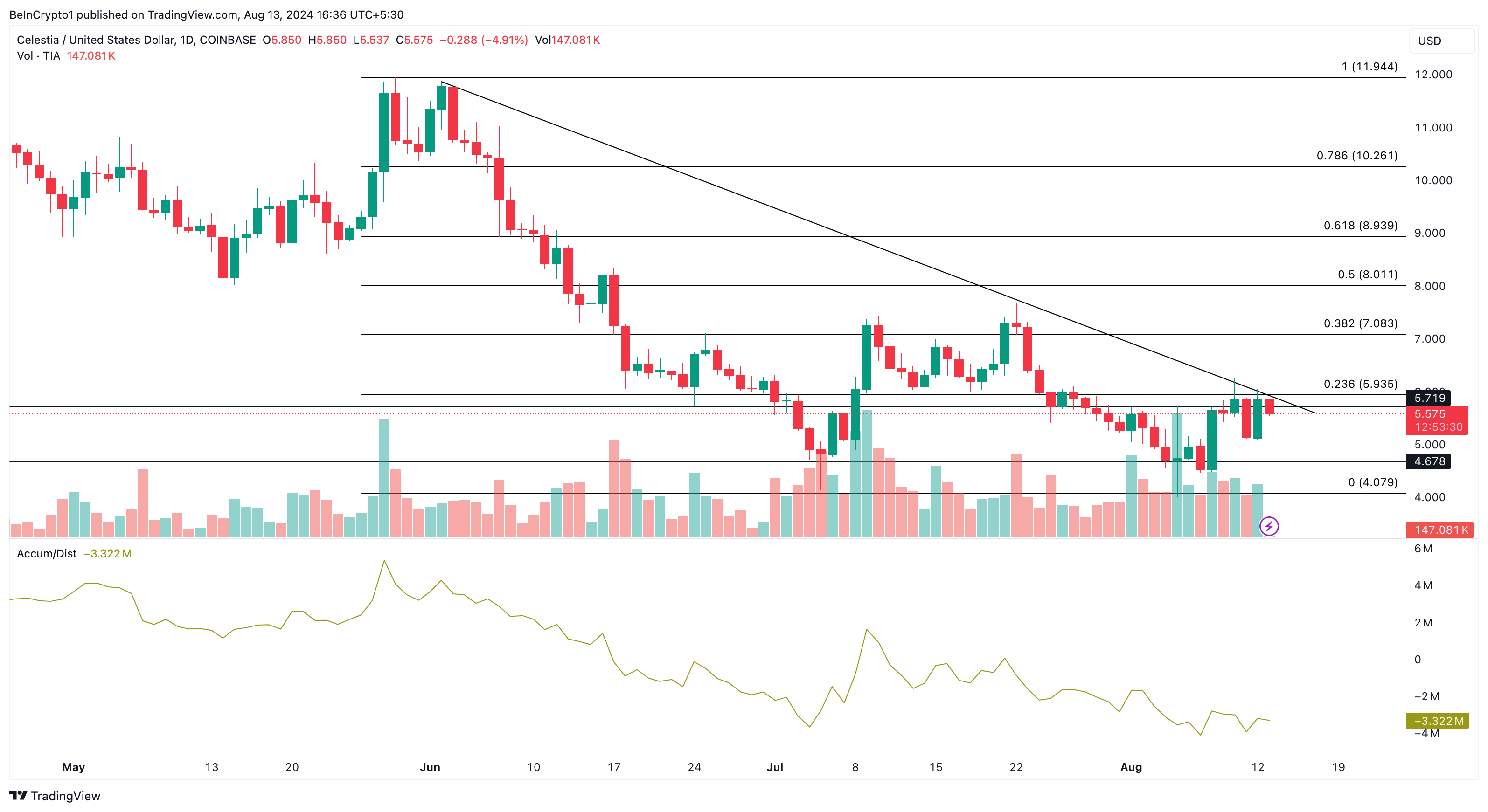 Men, at mislykkes i at gøre dette kan holde TIAs kurs fast under trendlinjen. Desuden afslører Akkumulering/Fordeling (A/D) indikatoren, at TIA mangler det nødvendige købstryk for at opretholde sin opadgående trend.