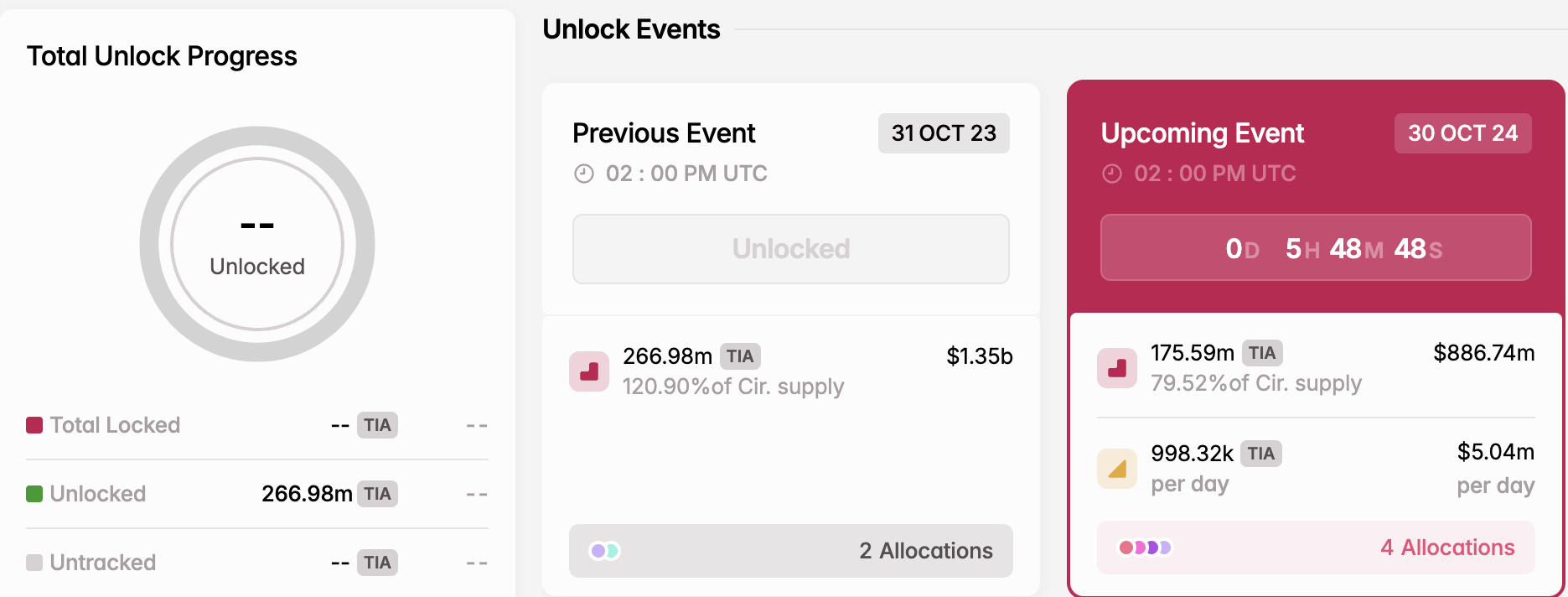 Ifølge Tokenomist (tidligere Token Unlocks) er frigivelsen af Celestia-tokens værdisat til 890 millioner dollars til den nuværende kurs. Når de er frigivet, vil det samlede antal tokens i omløb udgøre 80% af den samlede forsyning.