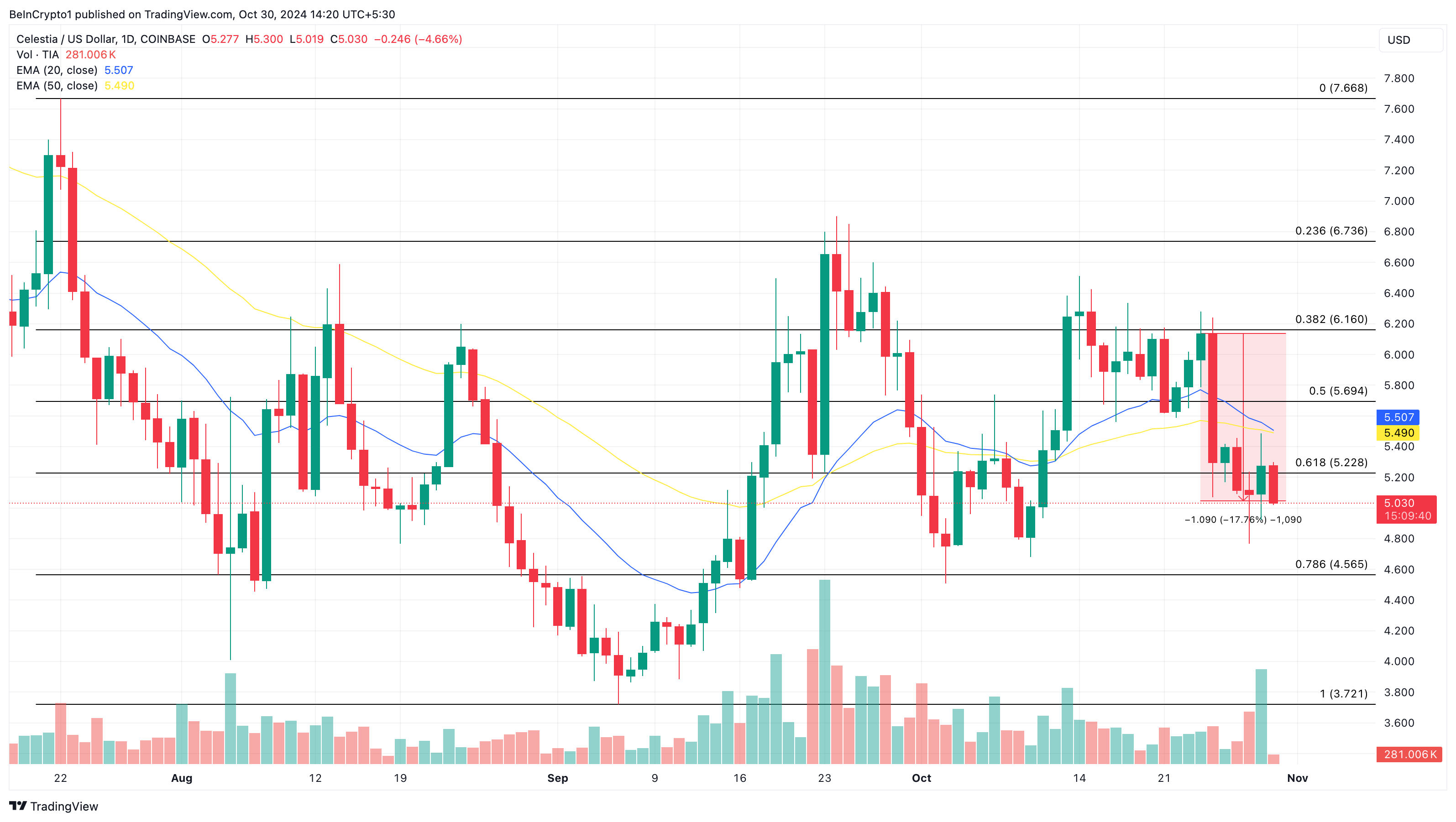 Men da altcoinens værdi er under begge indikatorer, har bears overtaget. Hvis dette forbliver det samme, kan TIA’s kurs falde til 4,57 dollars på kort sigt. Men hvis salgspres intensiveres, kan dette fald udvide sig yderligere, og tokenet kan falde til 3,72 dollars.
