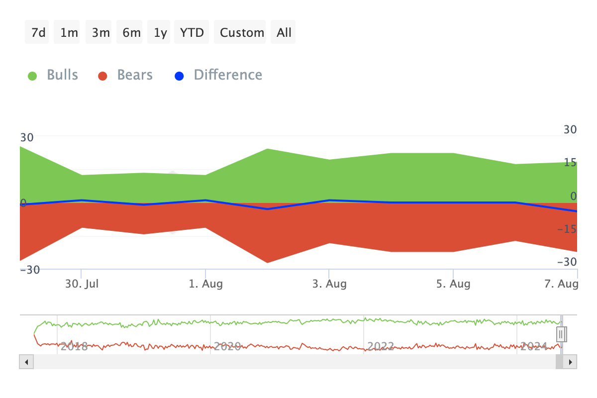 Hvis disse investorer fortsætter med at holde på tokenet i stedet for at likvidere, kan LINKs kurs stabilisere sig. Desuden antyder Bulls and Bears Indikatoren, at tokenet kan begynde at komme sig, da antallet af bulls har overhalet antallet af bears.