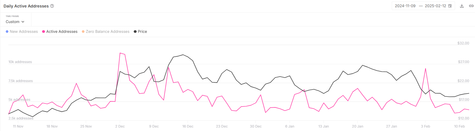 I øjeblikket er Chainlinks aktive adresser faldet til et to-måneders lavpunkt på 3.400, et tal der ikke er set siden november 2024. Dette fald i aktive brugere indikerer en aftagende interesse fra investorer, da færre deltager i transaktioner på netværket. Dette tyder på, at stemningen blandt LINK-indehavere er overvejende skeptisk.