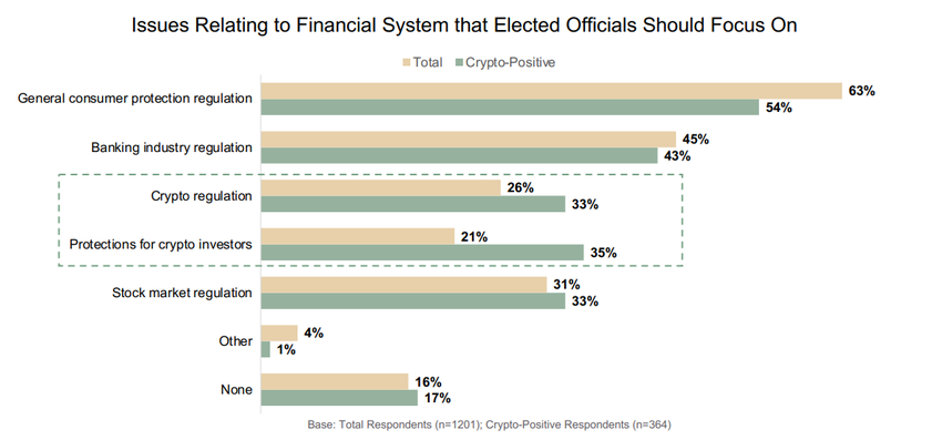 Ifølge Blockchain Association ser 1 ud af 5 amerikanske vælgere kryptovalutaer som et vigtigt emne. De ønsker, at embedsmænd skal fokusere på kryptoreguleringer og investorbeskyttelse. Disse spørgsmål betyder noget for henholdsvis 33 % og 35 % af de kryptopositive respondenter.