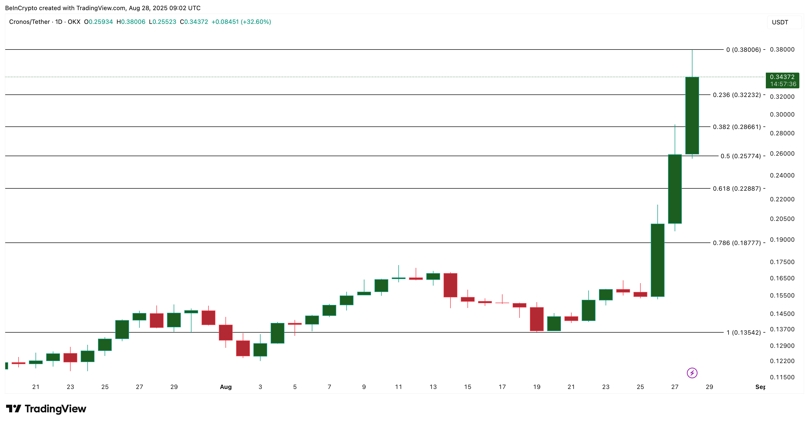 Cronos (CRO) kurs har forlænget sin imponerende stigning, med en kurs på $0,34 i øjeblikket, oppe med 55% på 24 timer og næsten 140% i den seneste uge.