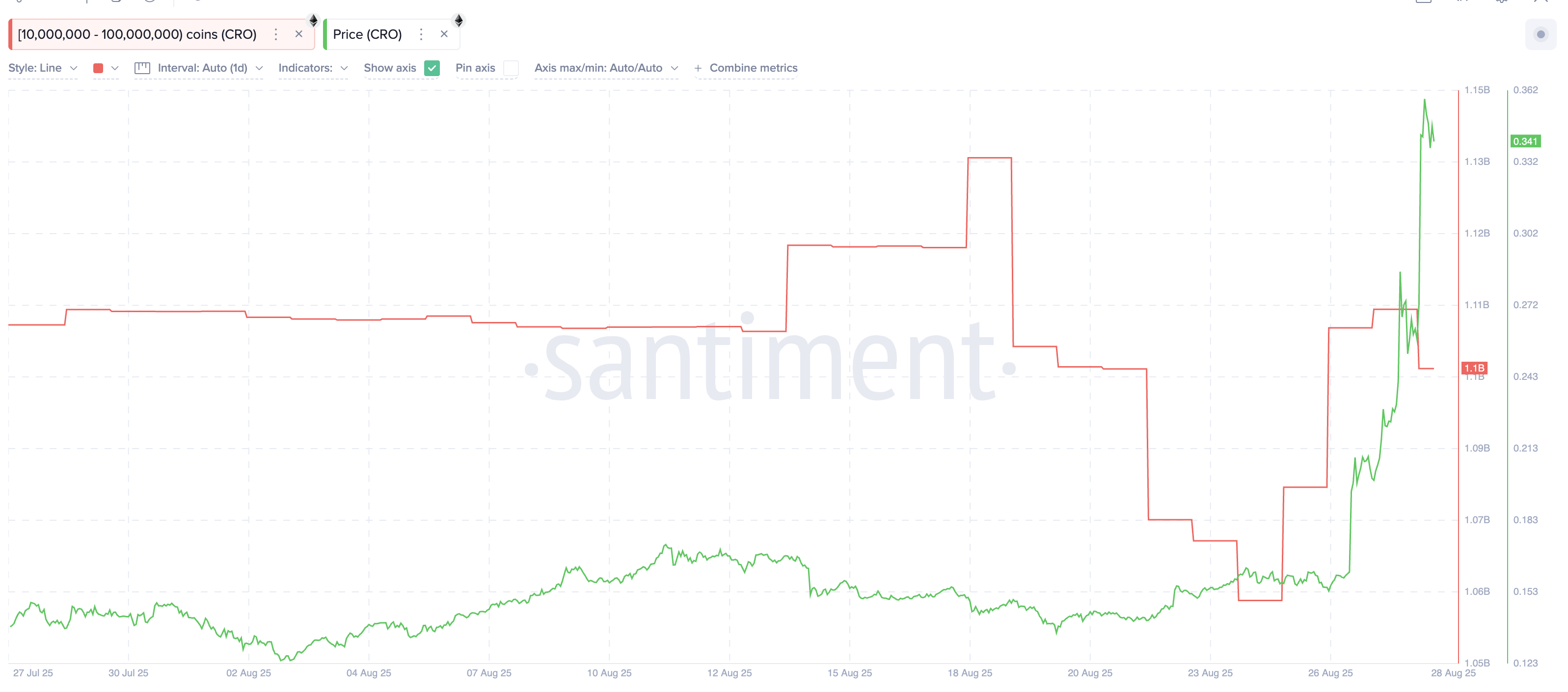For første gang i næsten to uger har store indehavere i 10 millioner–100 millioner CRO gruppen reduceret deres positioner. Deres wallets faldt fra 1,11 milliarder CRO til 1,10 milliarder CRO, en reduktion på cirka 100 millioner CRO værdi $34 millioner til nuværende kurser.