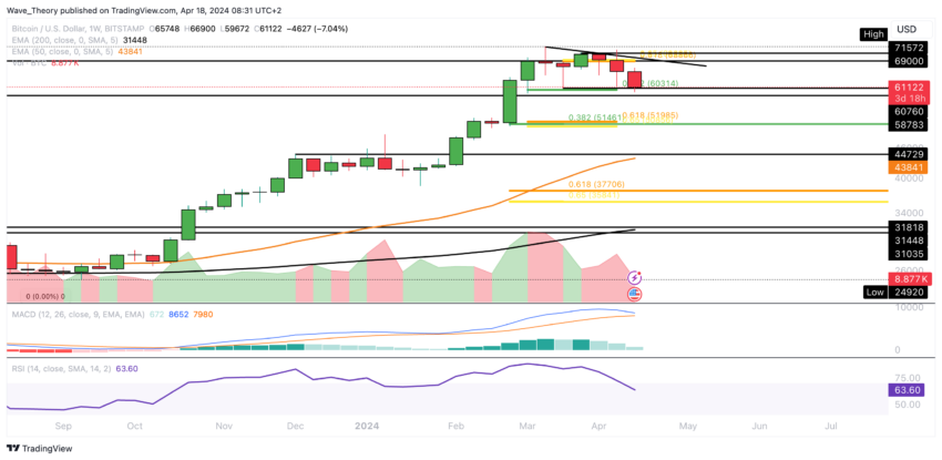 Bitcoin har i øjeblikket nået Fibonacci-supportniveauet på 0,382 ved ca. 60.300 dollars. Hvis dette supportniveau ikke holder, forventes de næste vigtige Fibonacci-supportniveauer at ligge mellem 51.000 og 52.000 dollars.