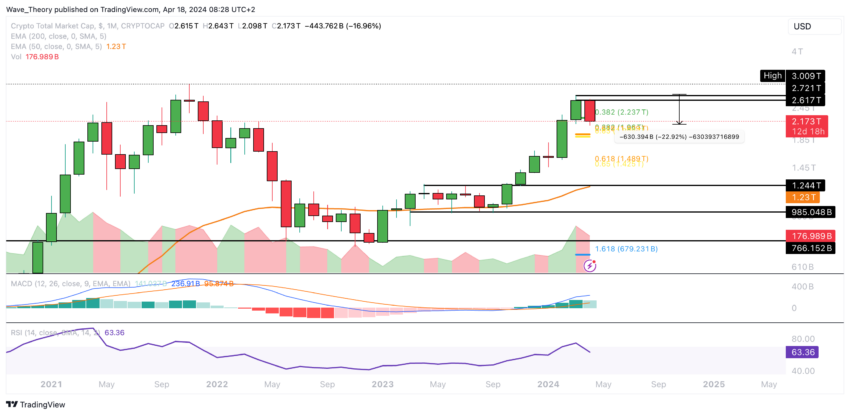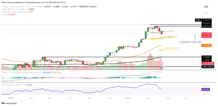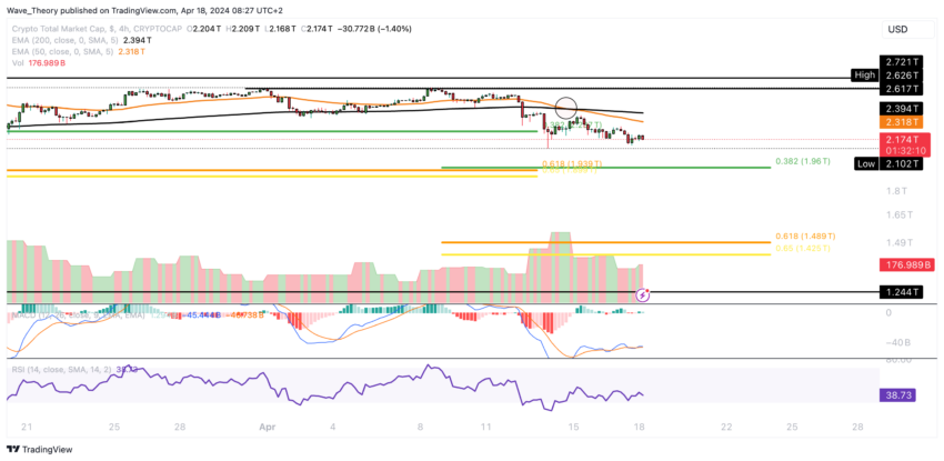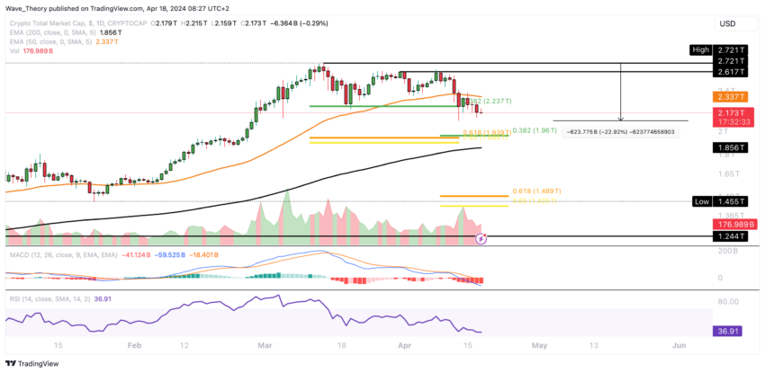 Hvis kryptomarkedet oplever en betydelig nedtur og bryder under Fibonacci-supportområdet mellem ca. 1,9 billioner dollars og 1,96 billioner dollars på en bearish måde, vil det næste betydelige Fibonacci-supportniveau kun være omkring 1,45 billioner dollars.