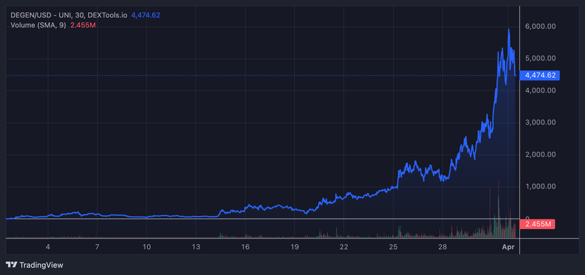 I en forbløffende kovending, eskalerede DEGENs værdi med over 4.400%, i sidste måned. På trods af det, opkøber investorerer stadig DEGEN, hvilket signalerer en vedvarende tro på markedet.
