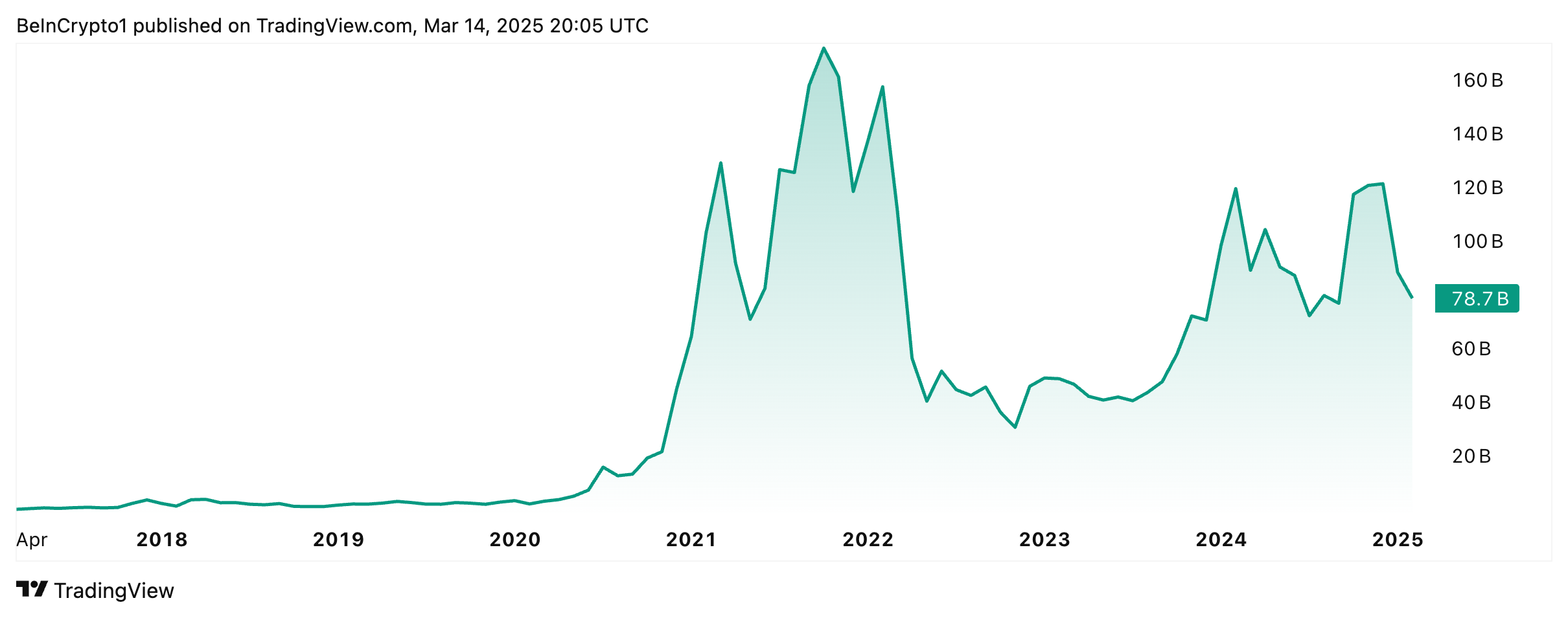 I oktober 2021 havde DeFi-markedet nået sin højeste markedsværdi, værdisat til næsten $172 milliarder. I dag ligger det tal på $78,7 milliarder.