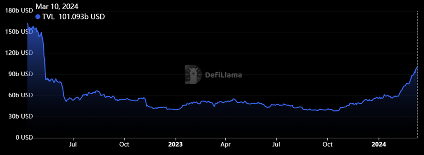 Ifølge on-chain data fra DeFillama har DeFi-sektoren oplevet en bemærkelsesværdig stigning på 44% siden januar 2024, fra 56 milliarder dollars til 100 milliarder dollars. Selvom dette ikke når op på den tidligere rekord på 189 milliarder dollars, der blev sat i november 2021, understreger det den eskalerende interesse for DeFi.