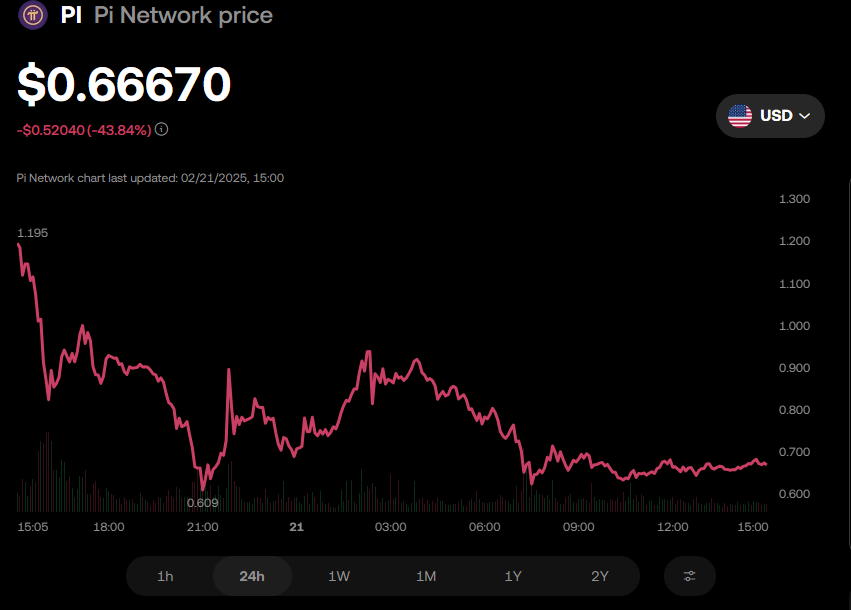 På trods af dette momentum faldt PI Coin’s kurs efter dens notering på OKX, en almindelig tendens hvor aktiver oplever korrektioner efter notering på grund af tidlig profittagning. Pi Network’s governance token blev handlet til $0.66 på OKX-børsen i øjeblikket. Det 43% fald siden fredagens session åbnede har nogle analytikere skuffede.