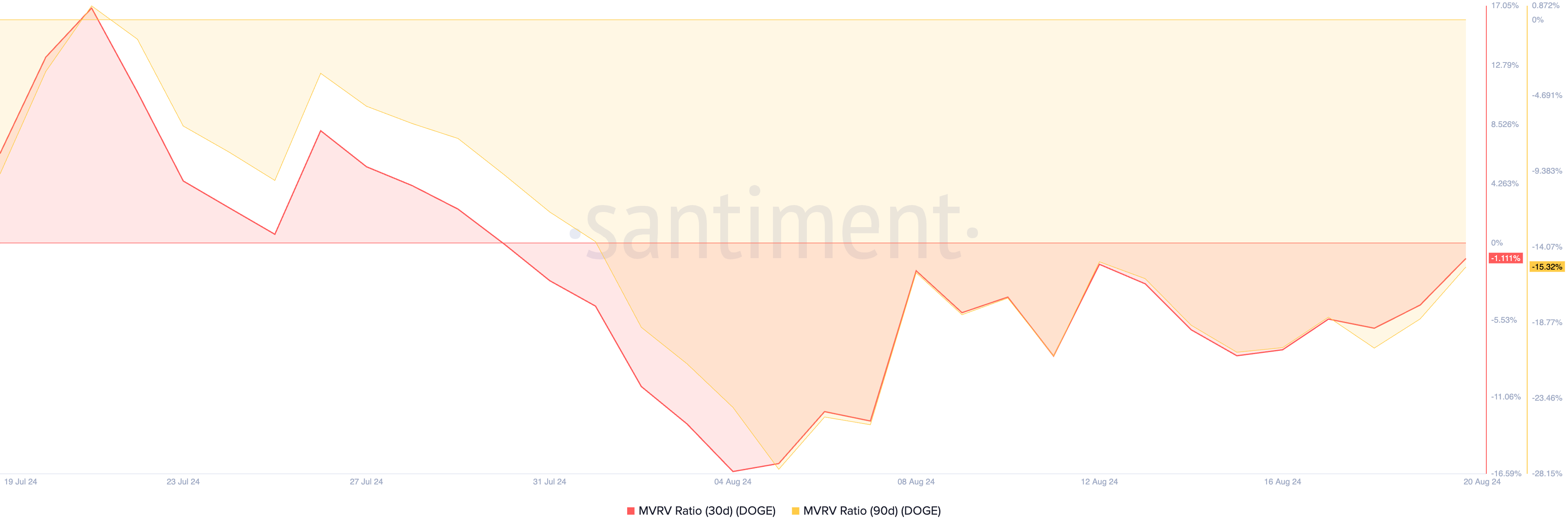 Ifølge den on-chain dataudbyder er møntens 30-dages og 90-dages MVRV-forhold henholdsvis -1,11% og -15,32%.