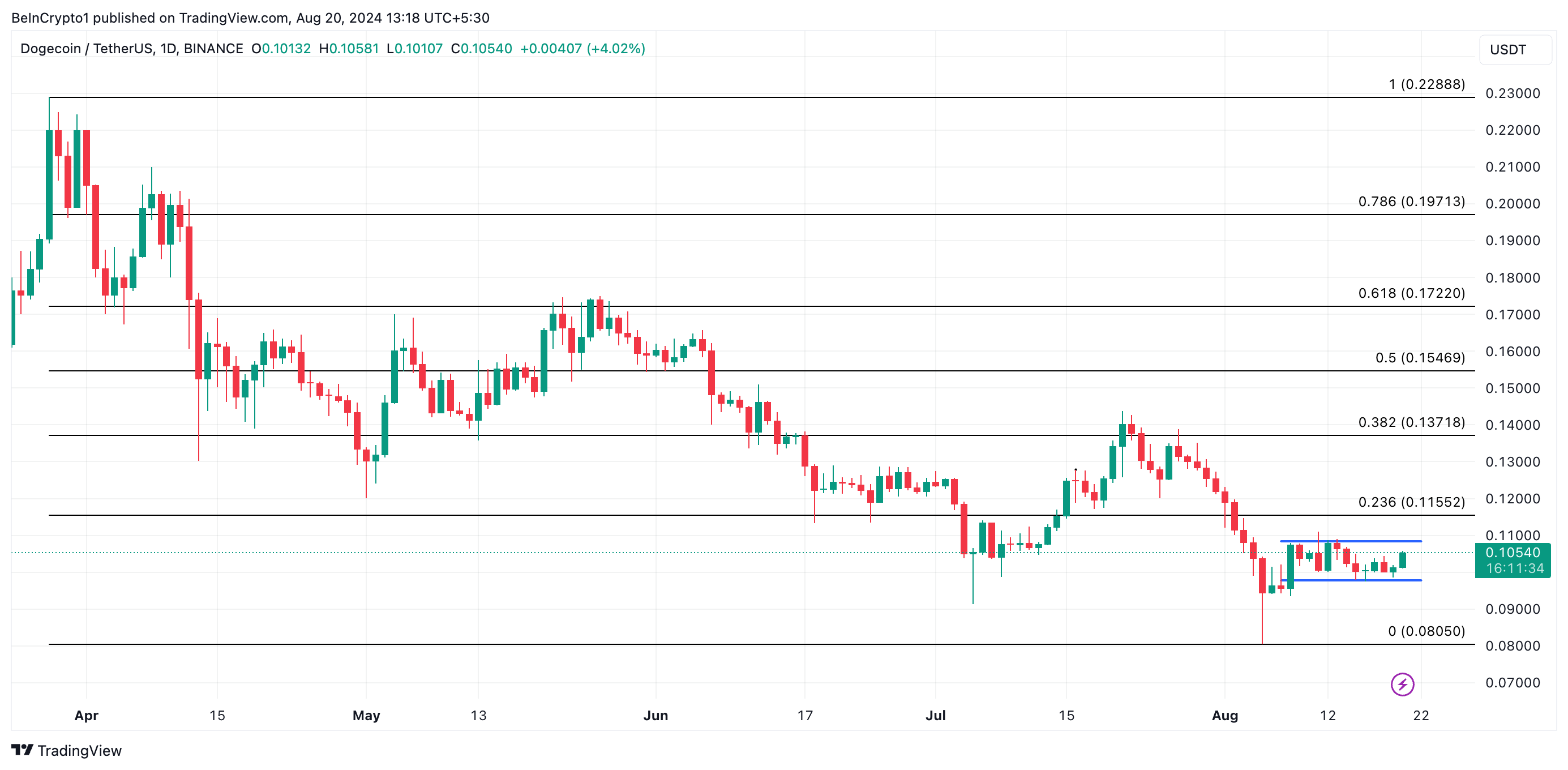 Siden dens værdi faldt til et syv-måneders lavpunkt på $0,08 den 5. august under det bredere markedets nedtur, har den førende meme-coin Dogecoin (DOGE) konsolideret inden for et interval.