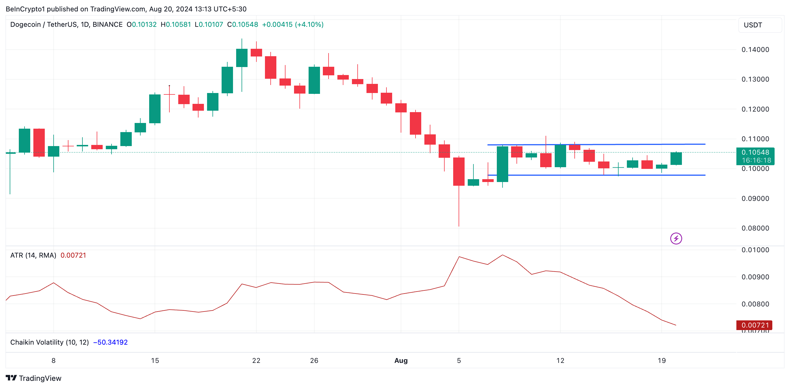 Kanalens øvre linje fungerer som modstand, mens den nedre linje fungerer som støtte. I DOGE’s tilfælde er modstanden dannet ved $0,10 og støtten ved $0,09. Når en aktivs pris forbliver inden for et snævert interval som dette, signalerer det lav volatilitet, da der ikke er nogen markante udsving.