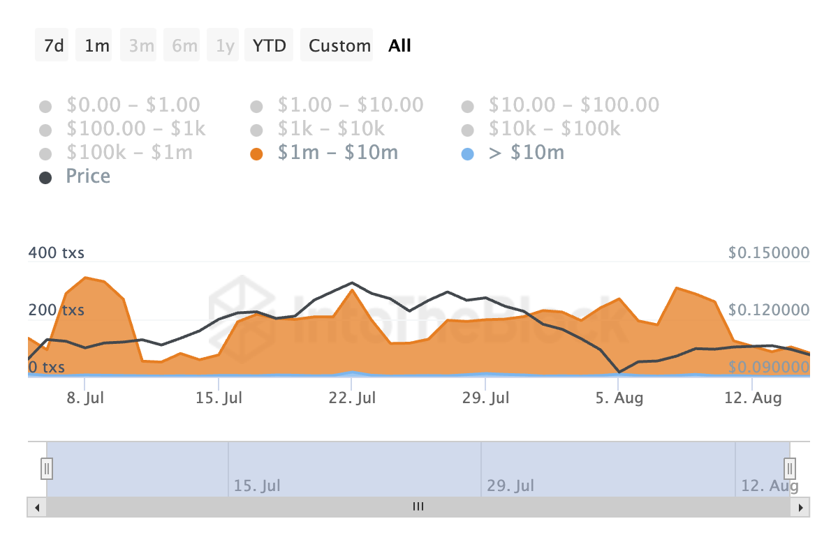 Data fra IntoTheBlock viser et markant fald i store transaktioner med Dogecoin. On-chain dataudbyderen rapporterer, at det daglige antal DOGE-transaktioner værd mellem $1 million og $10 millioner er faldet med 62% over de sidste 30 dage.