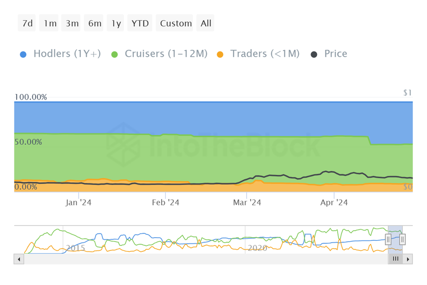 I løbet af de sidste to uger er udbuddet fra langtidsholdere steget med 9%, oppe fra 38%. Med 47%, er langtidsholdere nu den største gruppe af indehavere af DOGE. Disse investorer er kendt for at holde deres aktiver i mere end et år, hvilket viser, at tilliden til og overbevisningen om meme-coinen, er høj.