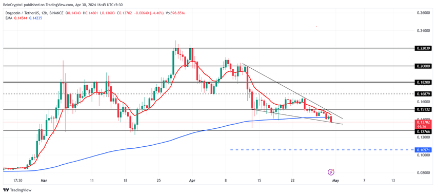 Dogecoin handles i skrivende stund til 0,137 USD, og bevæger sig inden for en faldende kile. Det er et bullish diagrammønster, og er kendetegnet ved konvergerende trendlinjer, med lavere øvre priser og lavere nedre priser, hvilket indikerer en potentiel trendomvending, når prisen bryder ud af kileformationen, i en opadgående retning.