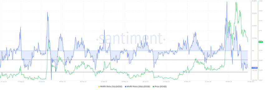 MVRV-forholdet måler investorens fortjeneste og tab. Dogecoins 30-dages MVRV på -15% signalerer tab, hvilket potentielt kan føre til akkumulering.