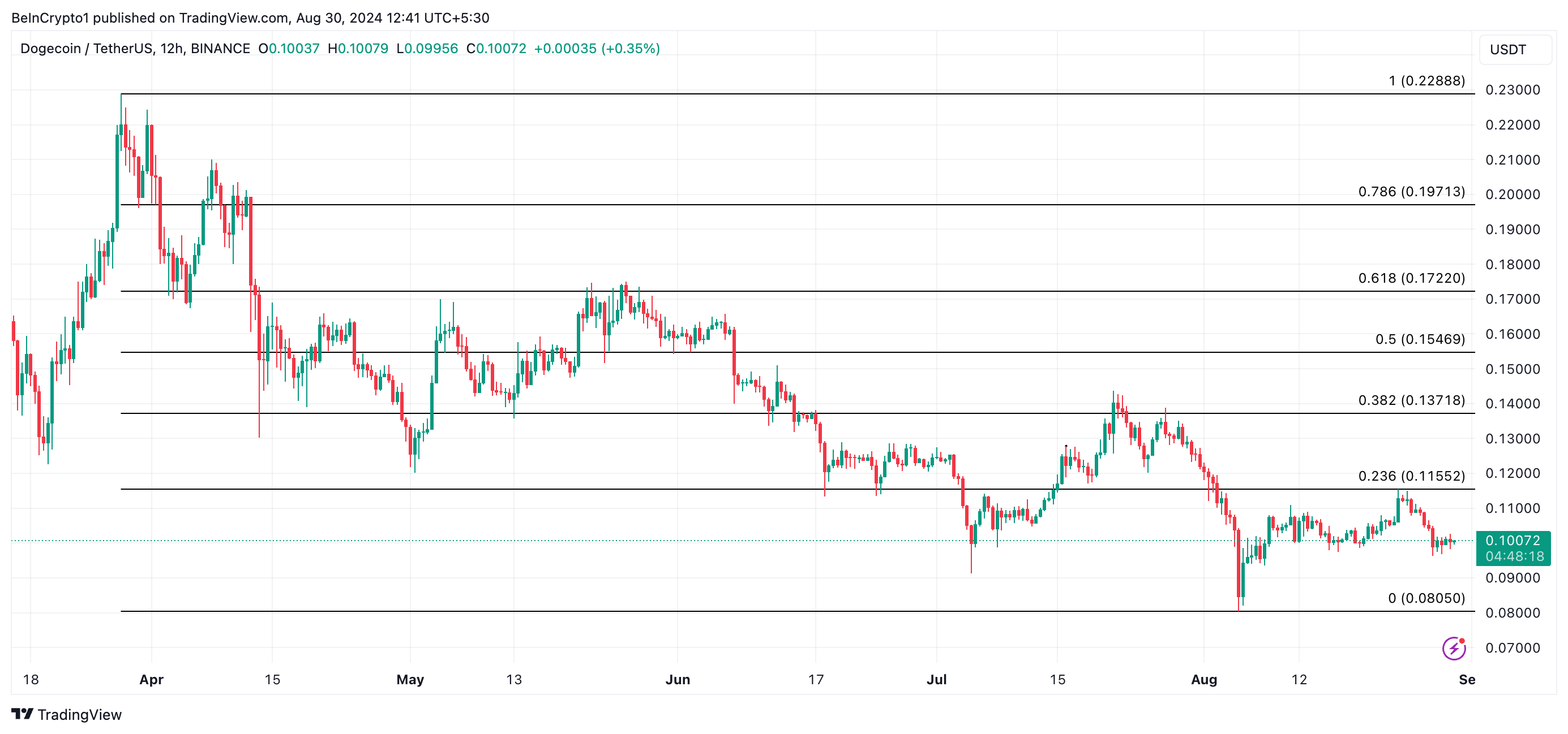 I øjeblikket handles DOGE til $0.10, hvilket viser et kursfald på 0,18% og et fald i handelsvolumen på 24% over de sidste 24 timer.